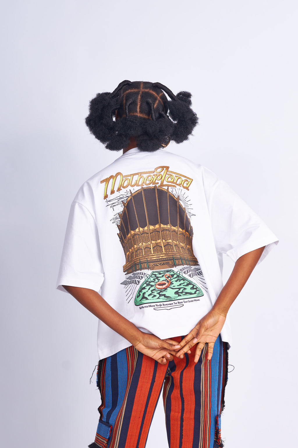 The MOTHERLAND Oversize Cropped T-Shirt is a visual love letter to Lagos and every road that leads you home. Featuring an illustrated National Arts Theatre and the phrase “No matter where you go, remember the road that leads home,” this piece is a statement of pride, place, and identity. Made for the ones who never forget their roots—even on the move.